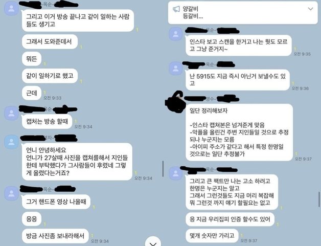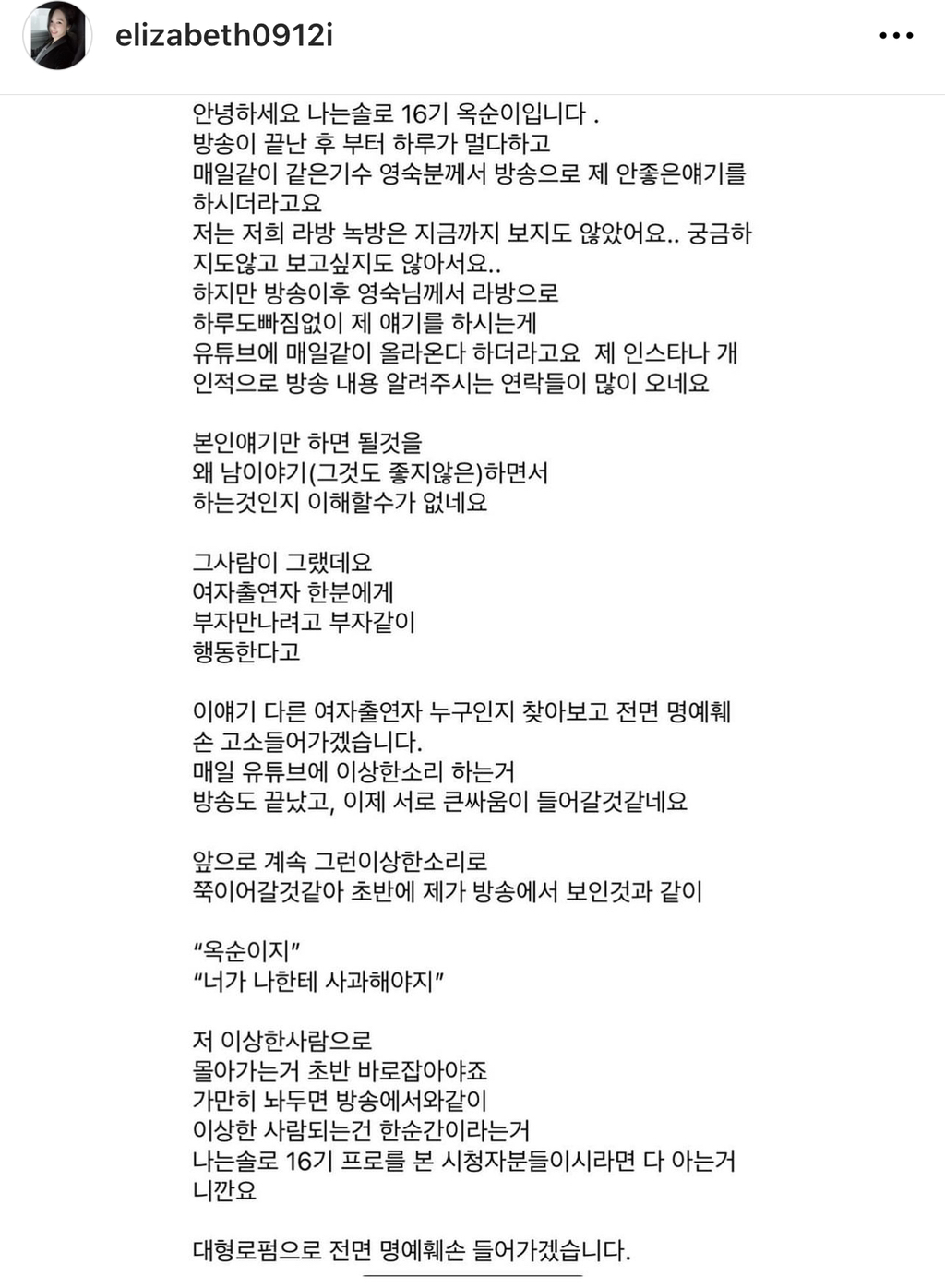 옥순이의 자작 의혹은 결국 ‘나는 솔로’ 출연자들의 단체 대화방까지 확산되었습니다. 11일 여러 온라인 커뮤니티에는 옥순이와 영숙을 비롯한 다른 출연자들의 대화 내용이 공개되었습니다. 이 내용을 보면 영숙이 옥순이의 자작 의혹을 제기하고 다른 출연자들도 옥순이를 몰아붙였습니다. 옥순이는 자신의 지인이 문제의 IP 주소를 사용한 것이라고 설명했습니다. 그러나 이를 믿지 않는 출연자들은 옥순이를 고소하자고 요구했습니다. 옥순이는 결국 사과하고 단체 대화방에서 나갔습니다.