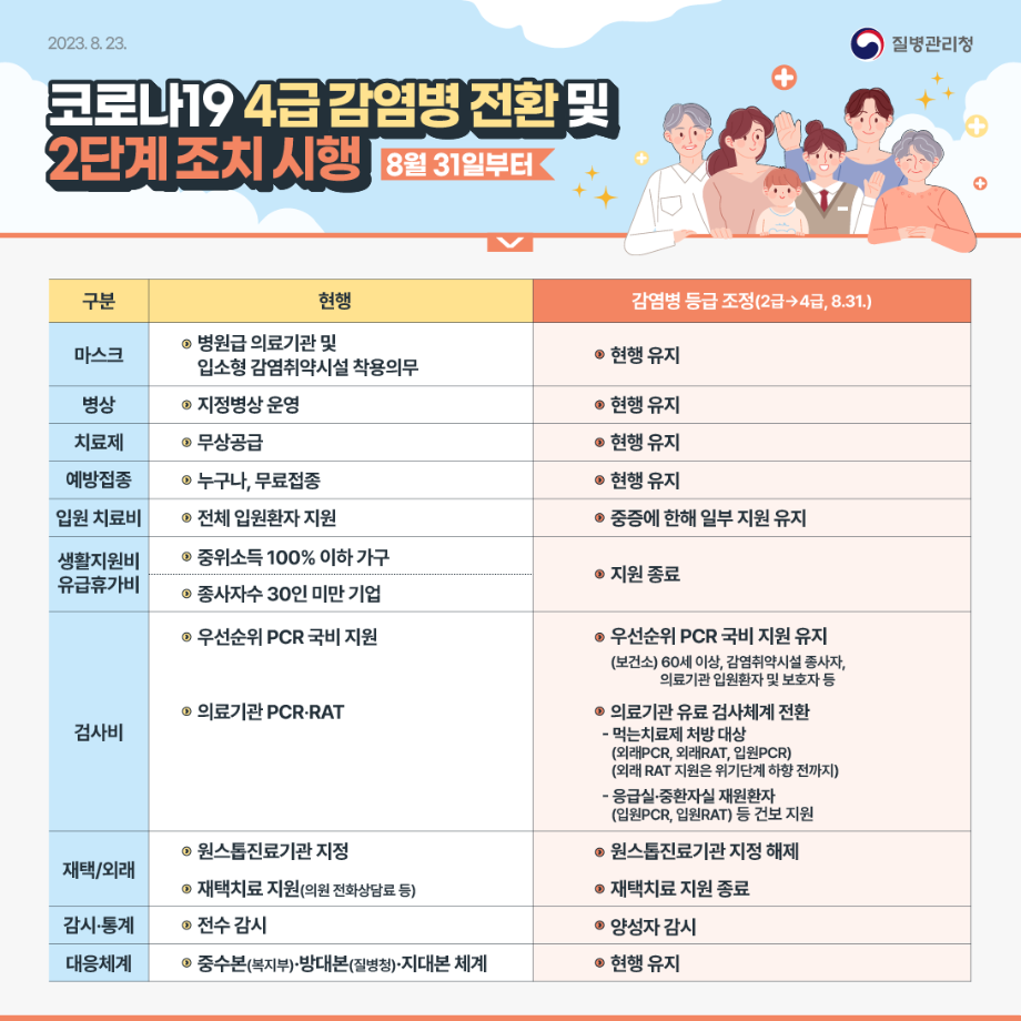 코로나19는 8월 31일 0시부터 법정 감염병 등급(1~4급) 중 가장 낮은 4급으로 하향되었습니다. 이는 코로나19의 위험도가 낮아졌다는 것을 의미하며, 국가적인 대응체계도 완화됩니다.